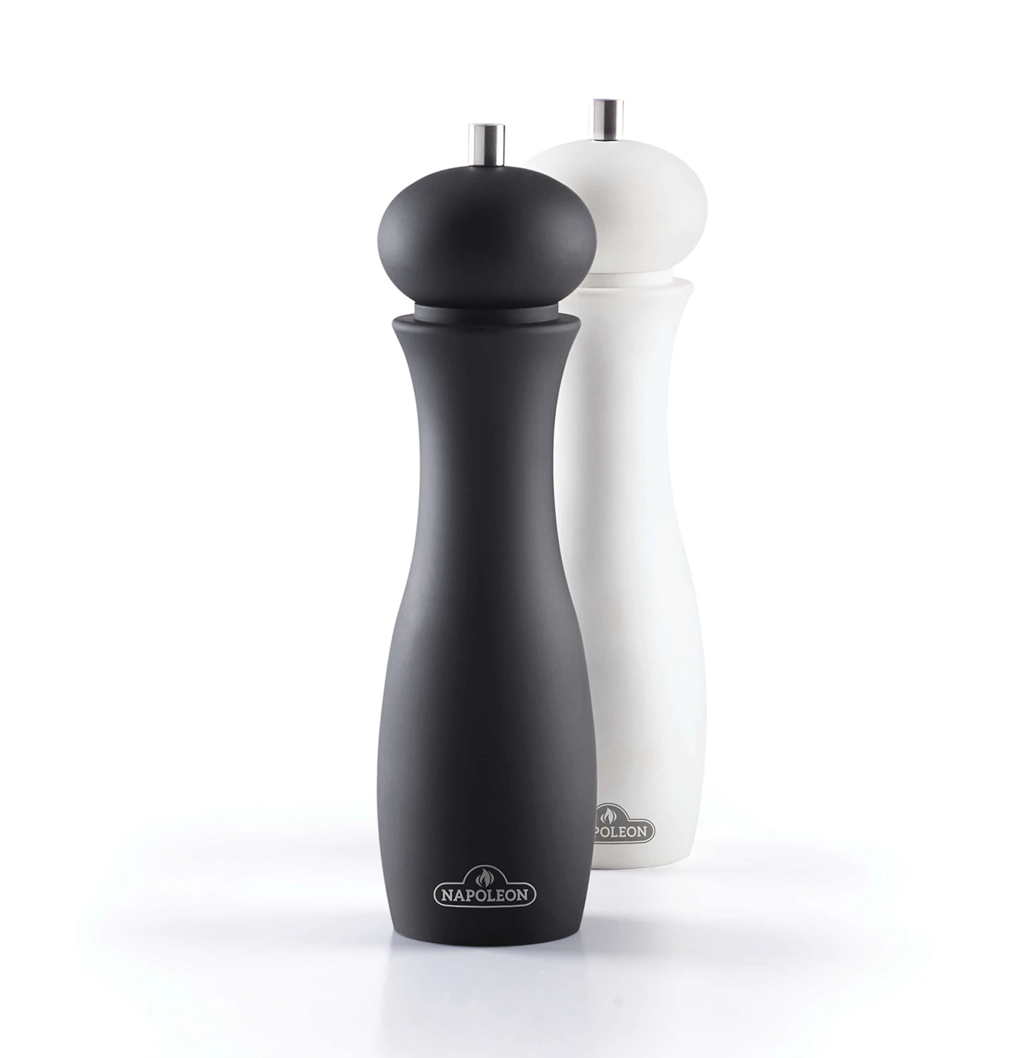 Die beiden großen Mühlen von Napoleon können sowohl als Salz- als auch als Pfeffermühlen benutzt werden. Damit man sie auf Anhieb unterscheiden kann, ist im Set eine schwarze und eine weiße Gewürzmühle enthalten.